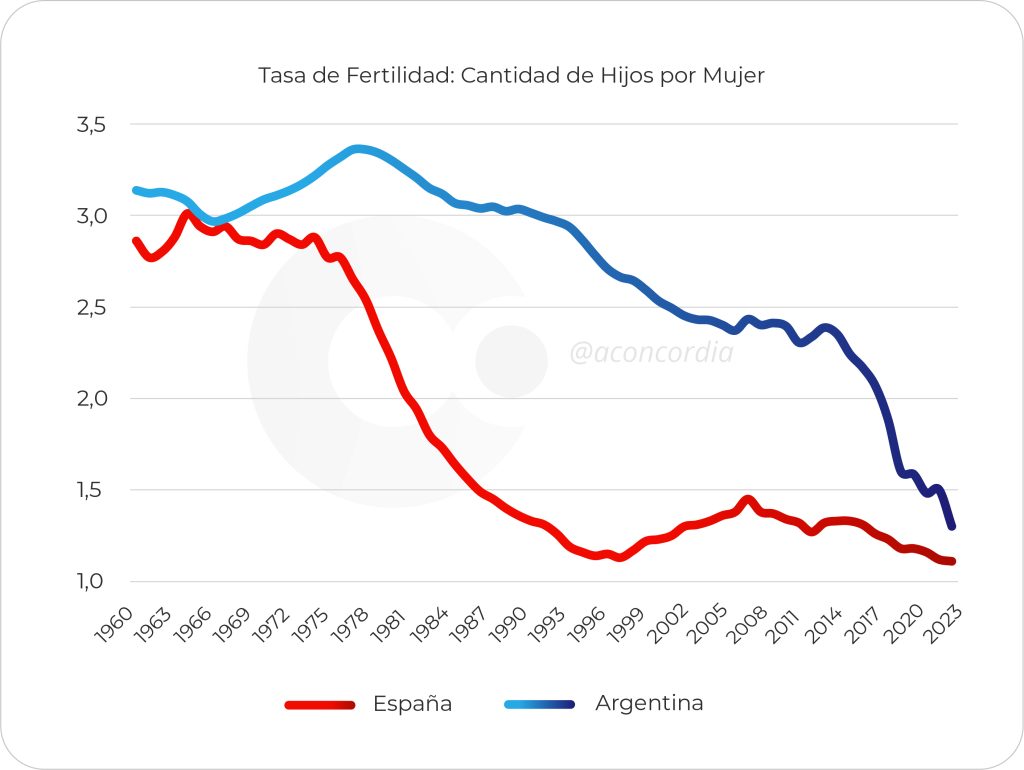 Nuestra Madre Patria es el espejo de nuestro futuro. El 2023 registró la cifra de nacimientos más baja de su historia, apenas 318.115. Quince años antes, en 2008, habían sido casi 520.000. En poco más de una década, los nacimientos se desplomaron un 40%. La tasa de fecundidad, el termómetro de la vitalidad de una nación, cayó en el mismo período de 1,44 a 1,12 hijos por mujer. En otras palabras: por cada 100 parejas, nacen 112 niños, una fórmula matemática para el decrecimiento. Aunque Argentina aún no llegó a esos niveles (1,3 hijos por mujer), nuestra caída ha sido mucho más vertiginosa en los últimos diez años.