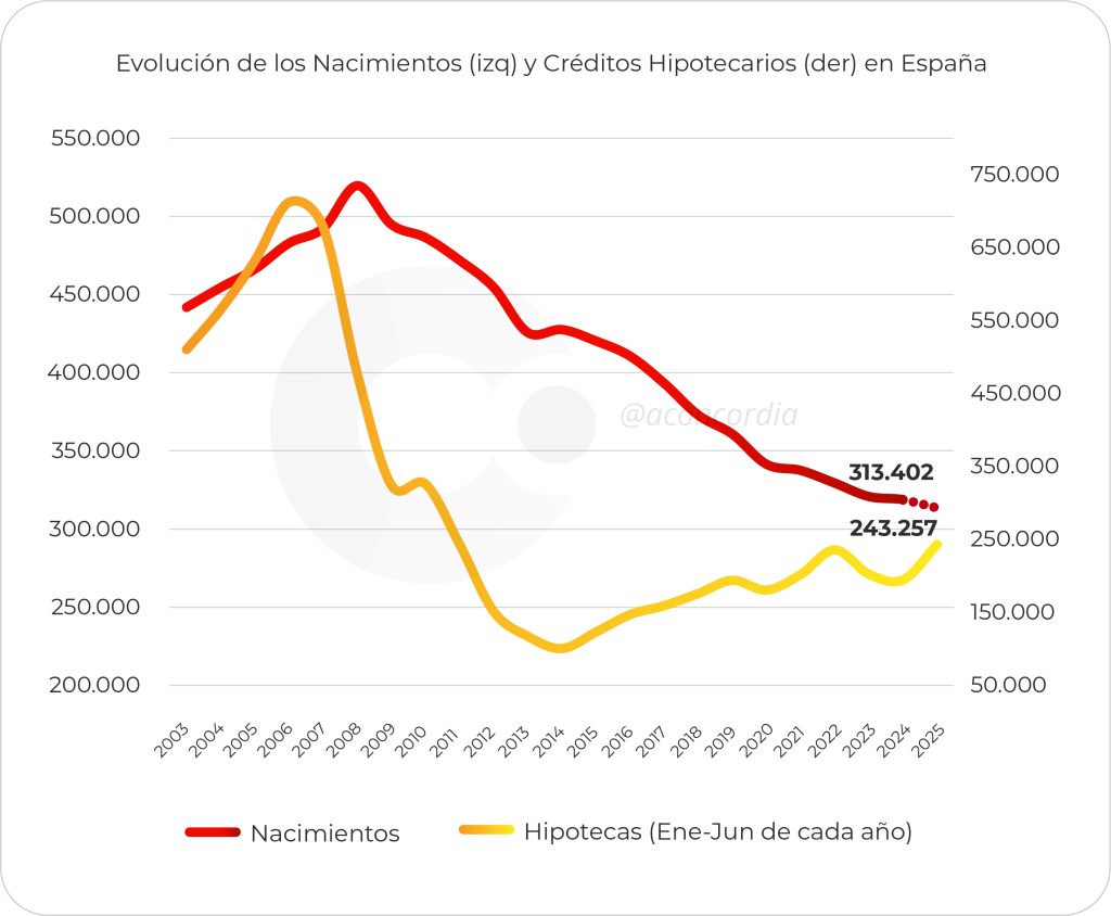 Entre 2003 y 2008, España vivió un repunte en los nacimientos que coincidió con un auge en el acceso a créditos hipotecarios. Cuando la burbuja estalló en 2007, la caída en las hipotecas otorgadas fue estrepitosa, y los nacimientos la siguieron en su derrumbe.