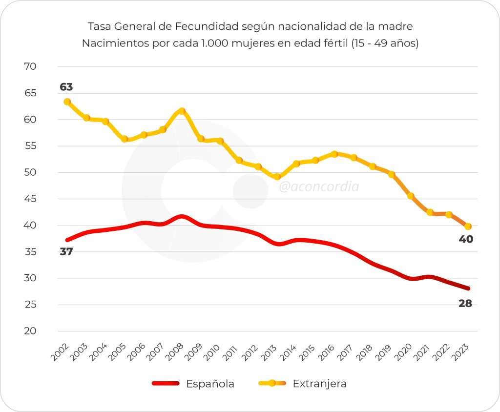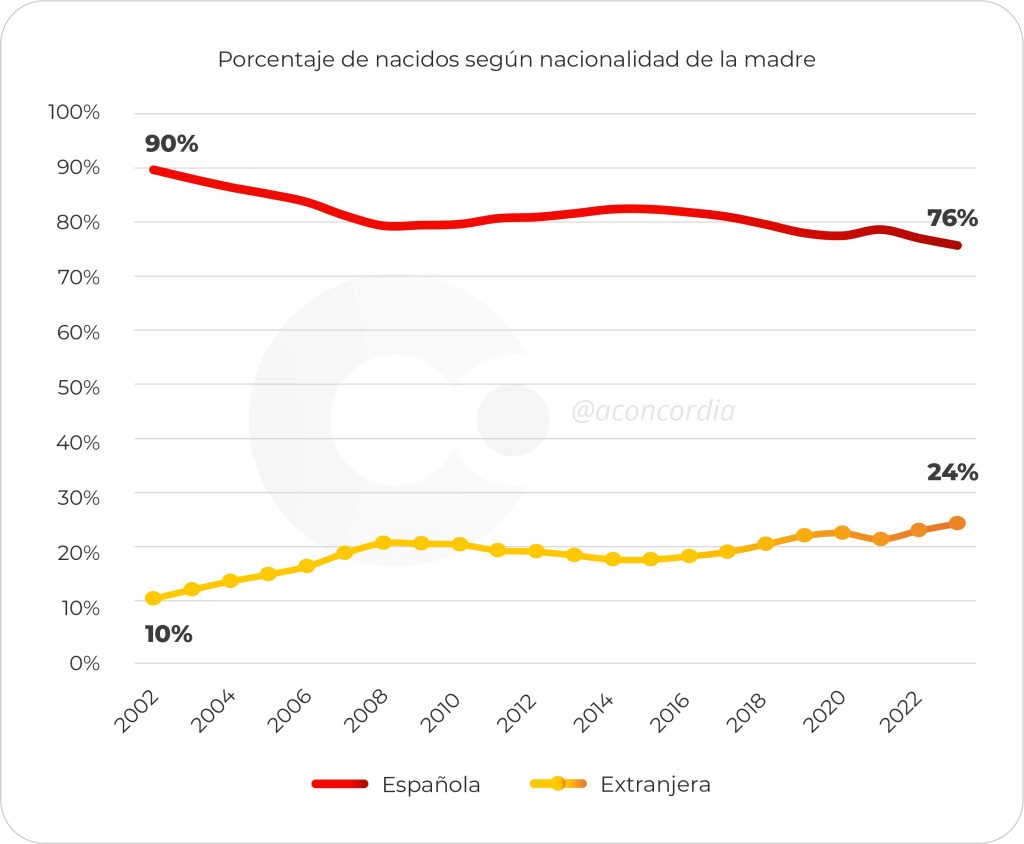 Sustento demográfico externo: Son los inmigrantes quienes, con una mayor tasa de natalidad, sostienen mínimamente las cifras demográficas del país. Hace veinte años, 9 de cada 10 nacimientos eran de madre española; hoy, casi 1 de cada 4 bebés que nacen en España es de madre extranjera.